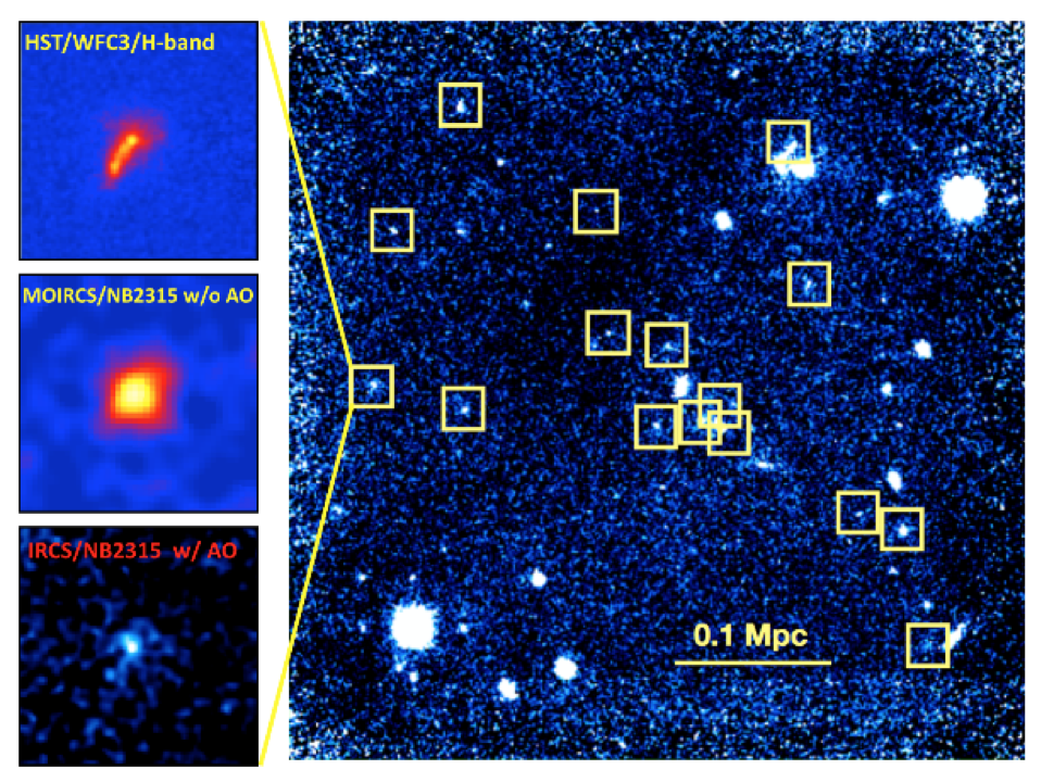 z=2.5の原始銀河団(110億年前)の高解像度なHα輝線マップ。個々の星形成銀河も空間分解可能で、銀河団中での銀河の初期形成の様子が分かる(Suzuki et al. 2018)。