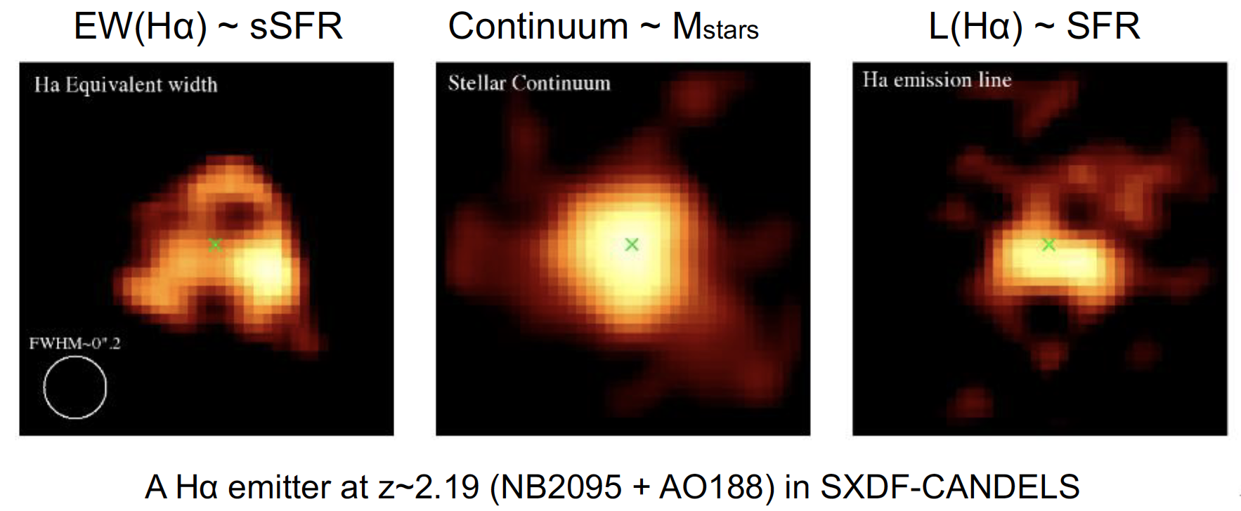 同様に同時代の一般フィールドの星形成銀河を空間分解した例。星形成活動の指標であるHα輝線と星質量の分布を表す連続光のマップ、またそれらを割り算した輝線等価幅の図が示されている(Minowa et al. 2018)。