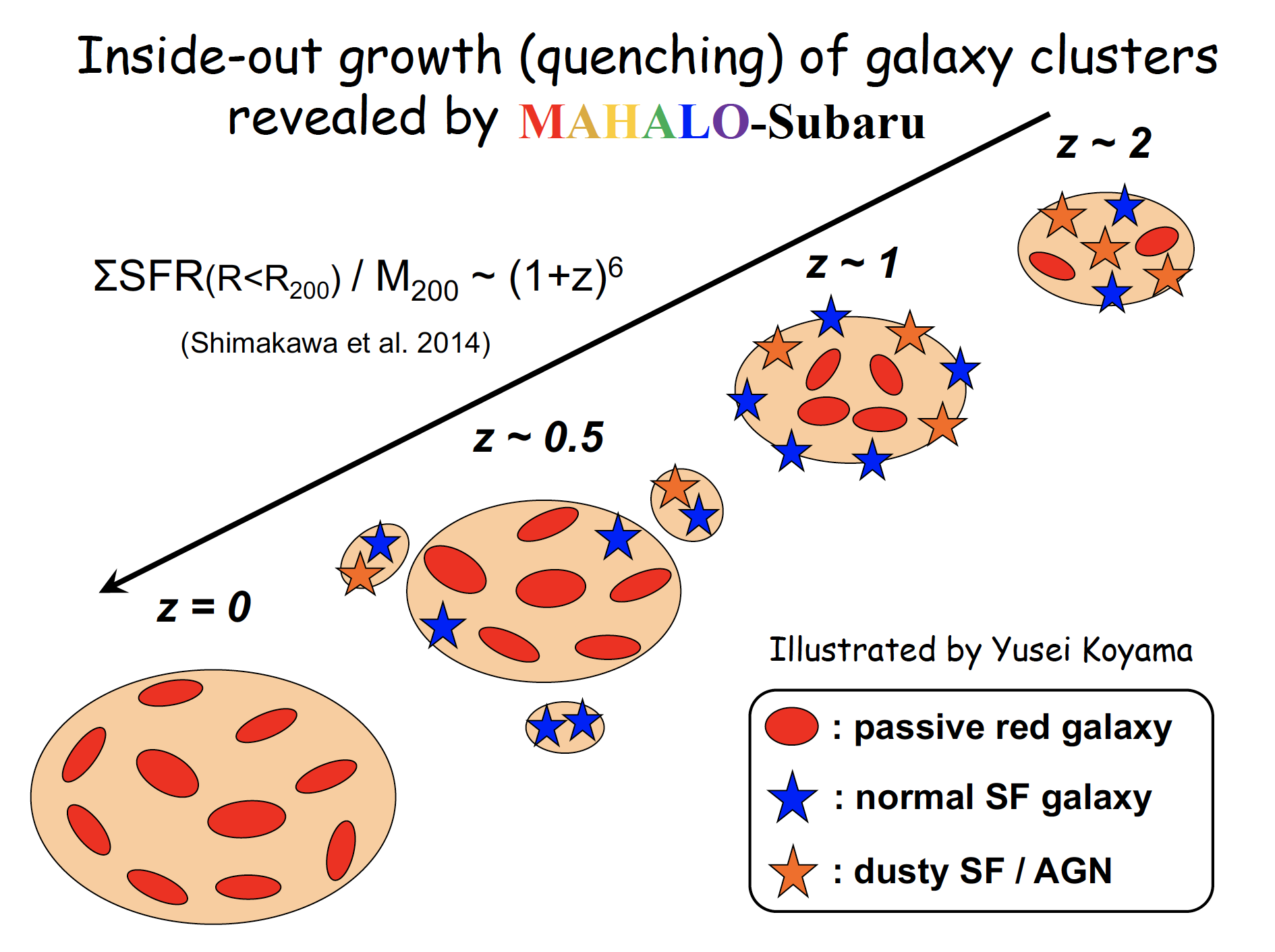 原始銀河団では中心部で非常に活発な星形成活動を行なっているが、時間が経つに連れて、中心部の星活動性は低下し、活動のピークは銀河団の外側へと移行していく様子が明らかになってきた。これを「インサイド・アウトな星形成の終焉現象」と呼んでいる。