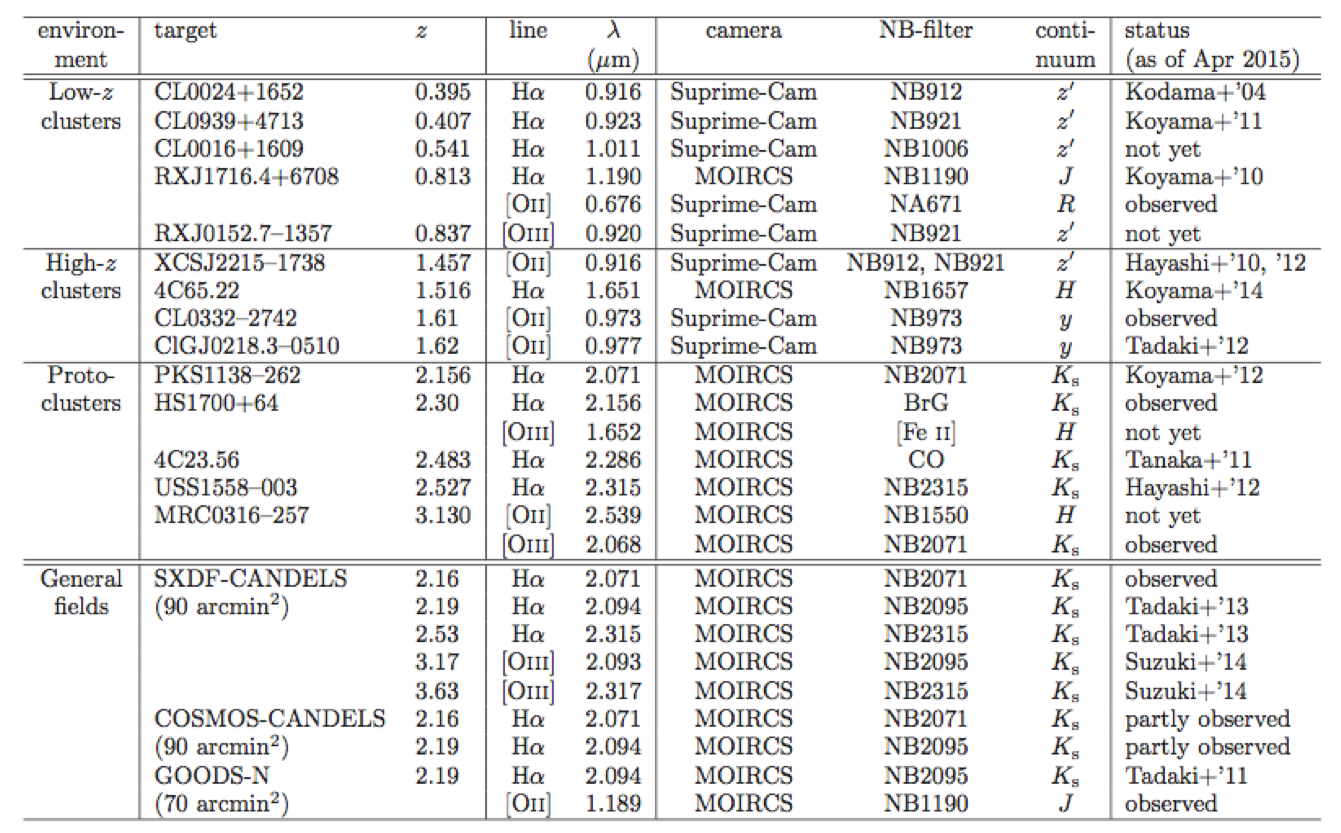 すばる望遠鏡の可視カメラ(Suprime-Cam)および近赤外カメラ(MOIRCS)に多数の狭帯域フィルターを製作して搭載し、星形成銀河から放射される輝線がそれぞれのフィルターに赤方偏移して来る距離にある遠方銀河団と一般フィールドにおいて、輝線銀河(星形成銀河)を一網打尽に捕らえ、銀河団とその中での銀河の星形成史を、一般フィールドと比較しながら解明しようというプロジェクト。2011年にすばるインテンシブプログラムに採択されてから本格的に開始。宇宙における銀河形成の最盛期を跨いで、銀河団の形成、成長とともに、その中で星形成活動がいつどのように進行し、空間的に伝搬していくのかを捕らえる。