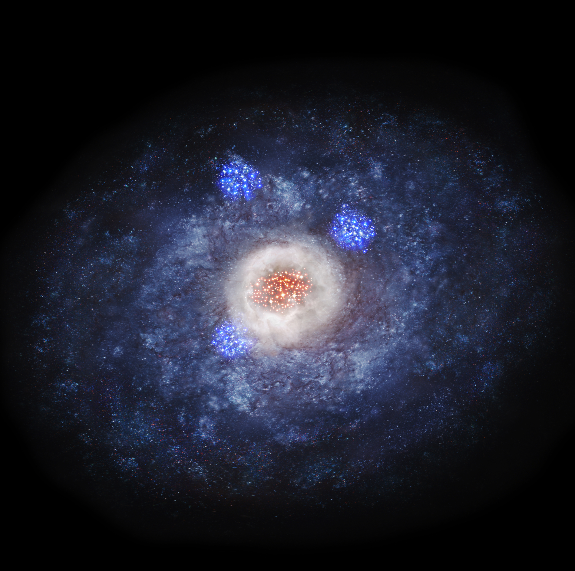 様々な観測データから想像される遠方の形成途上銀河の様子(例)。円盤部には星形成を活発に行なっている複数のクランプが存在し回転運動を行なっている。一方銀河の中央部にはダストや分子ガスが集中するコンパクトなコアが存在する。前者が中央に落ち込み、後者のバルジ成分が形成されていると考える事ができる。