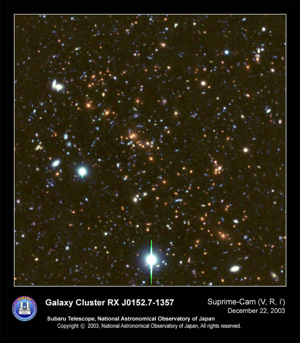 すばるの主焦点カメラ(Suprime-Cam)で撮影した、今から70億年前の宇宙(z~0.8)にある銀河団の中央部分の拡大図。赤やオレンジ色の銀河の複数の塊が北東(左上)から南西(右下)方向にチェーン状に連なって存在しており、銀河の塊が寄せ集まって銀河団が形成されてくる様子を捕らえている(Kodama et al., 2005, PASJ, 57, 309)。
