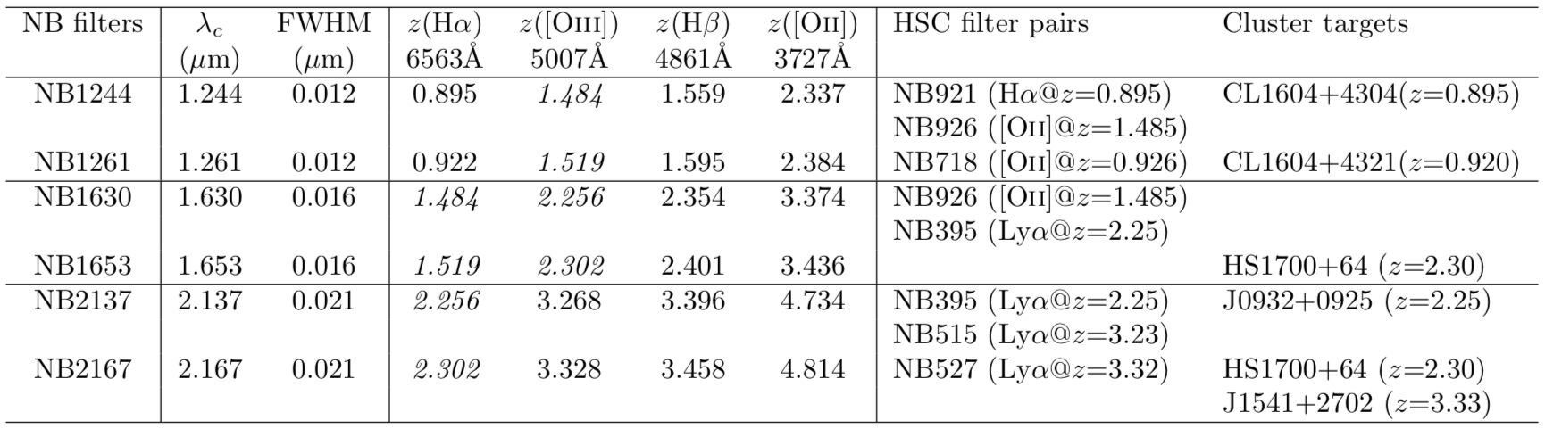 SWIMS-18が使用する、6枚の狭帯域フィルターの仕様一覧。Hyper Suprime-Cam (HSC)の狭帯域フィルターとのペアリング(同じ銀河からの違う輝線を捕らえる)や、それぞれのフィルターで観測可能な既知の銀河団も示されている。