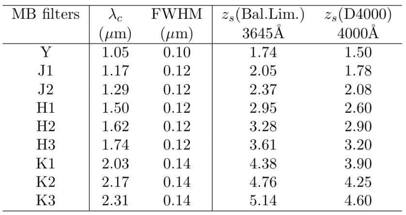 SWIMS-18サーベイで使用する9枚の中間帯域フィルターの仕様一覧。またそれぞれがスペクトルの特長を捕らえる銀河の赤方偏移を示す。