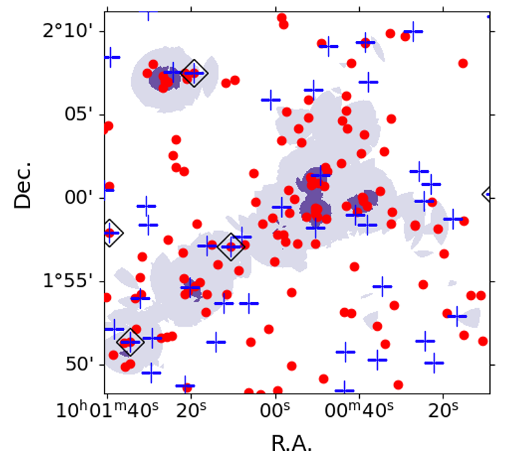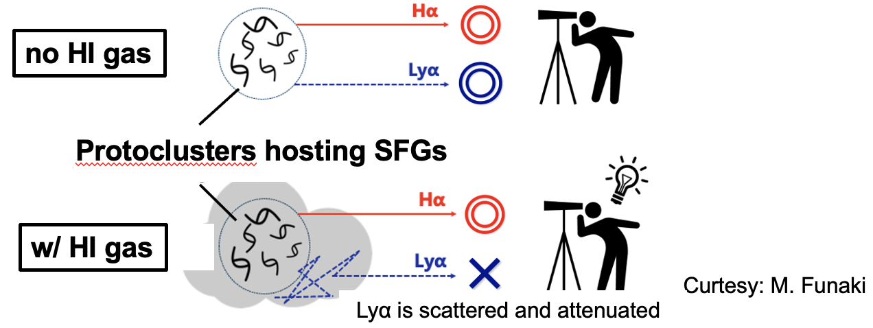 COSMOS領域のz=2.23にある原始銀河団とその周辺領域。赤丸がHα輝線銀河、青十字がLyα輝線銀河を示す。コントアは銀河の密度を表しており、原始銀河団のコア、その周りに繋がるフィラメント構造、銀河群が見られる。密度の高い領域ほどHα輝線銀河が主体でLyα輝線銀河はほとんど見られなくなることがわかる。これは高密度領域に中性水素ガスがより多く集まっており、Lyα輝線を散乱旧守しているためと考えられる。