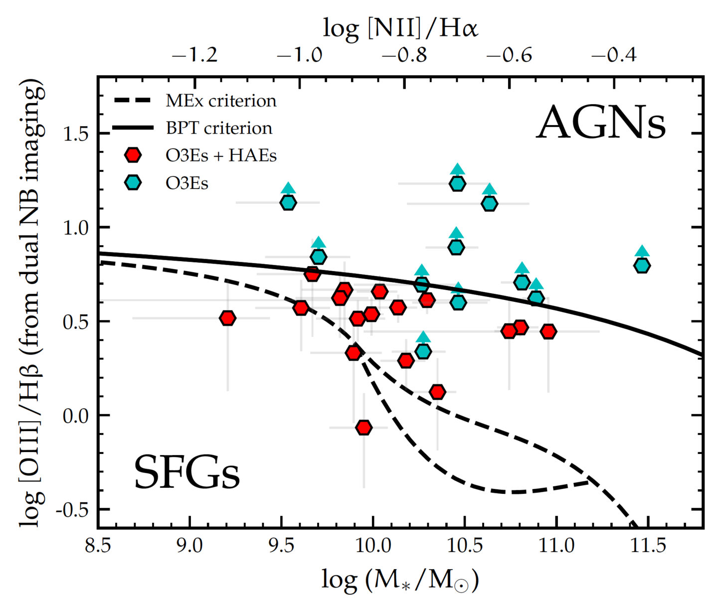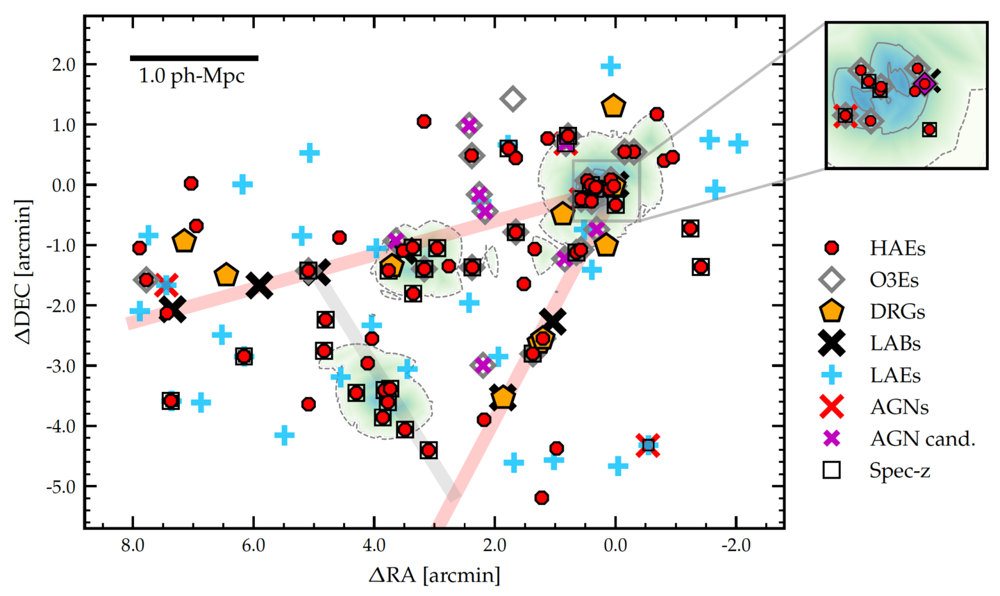 広視野カメラに搭載した狭帯域フィルターのペアを使って、Hα と [O III] 輝線を共に捉えることで、分光観測を行わずに特定の赤方偏移にある銀河を効率よく選択できる。また[O III]/Hα 比が極端に高い AGN 候補や、逆に[O III]/Hα 比が極端に低い 超低金属量銀河候補を撮像観測だけで探すことができる。すばる望遠鏡/MOIRCSやTAO/SWIMSを用いて観測を進めているが、将来的には、ULTIMATE-Subaru で同様の観測を行うことで、より広い視野を活かした効率の良いサンプル構築が可能となる。さらに高い空間分解能を活かして銀河の内部輝線構造も調べることができる。